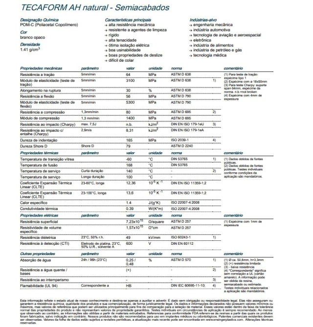 TECAFORM AH acetal natural é um POM-C sem cargas com um balanço único de propriedades físicas que não está disponível na maioria dos demais termoplásticos. Este acetal copolímero é um plástico de engenharia feito para uma ampla gama de aplicações universais em diversas indústrias diferentes. As características chave de desempenho do copolímero POM não modificado incluem alta resistência mecânica e rigidez, excelente desgaste, baixa absorção de umidade e excelente estabilidade dimensional. O copolímero POM-C não preenchido é fabricado pela Ensinger sob a marca TECAFORM AH natural, e oferece alta cristalinidade e um bom grau de tenacidade (mesmo na faixa de temperatura mais baixa), combinados com boa resistência química.