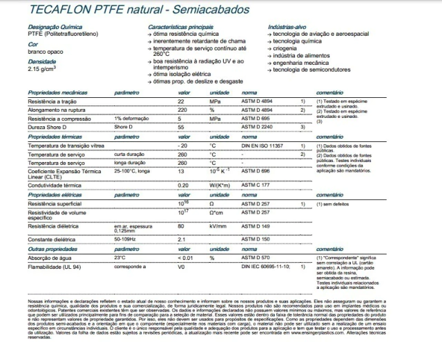 O PTFE (quimicamente conhecido como Politetrafluoroetileno, coloquialmente chamado Teflon®) é um fluoropolímero semi-cristalino com diversas características exclusivas. Este fluoropolímero possui estabilidade térmica alta e resistência química incomuns, assim como um alto ponto de fusão (temperatura de uso contínuo de -200 a +260°C, suportando picos até 300°C). Além disso, o PTFE possui excelentes propriedades de deslizamento, excelente resistência elétrica e de deslize. Em contraste, isso se deve, porém, à sua baixa resistência mecânica e um alto peso específico quando comparado a outros plásticos. A fim de melhorar as propriedades mecânicas,os plásticos PTFE podem ser reforçados com aditivos como fibra de vidro, carbono ou bronze. Devido à sua estrutura, o Politetrafluoroetileno é muitas vezes conformado usando um processo de compressão e depois é usinado com ferramentas de corte na usinagem.