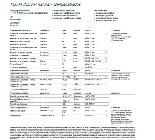 O polímero PP, quimicamente conhecido como polipropileno, é um termoplástico semi-cristalino fabricado pela polimerização do propano. O polipropileno pertence ao grupo das poliolefinas. Os polipropilenos (PP) são plásticos padrão universais com propriedades bem equilibradas proporcionando excelente resistência química, alta pureza, baixa absorção de água e boas propriedades de isolamento elétrico. Além disso, o material PP é leve e pode ser soldado. A tecnologia de processamento única fornece qualidade insuperável em formas de estoque de plástico PP.