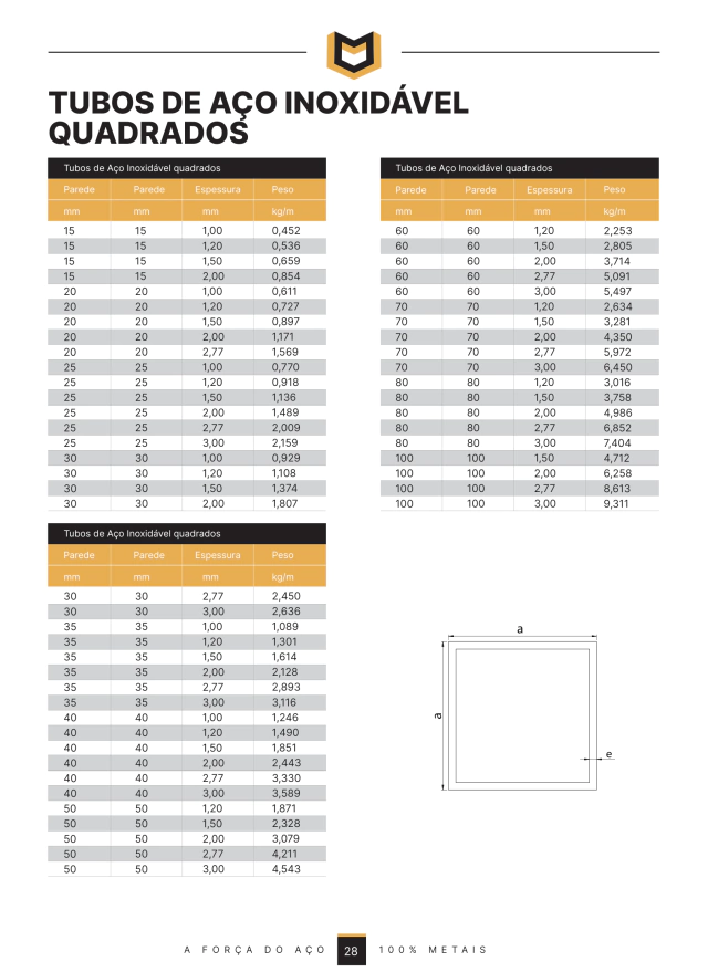 Os tubos quadrados 304 são provenientes de tiras de aço inoxidável 304, submetidas a processo de perfilação e soldagem, sendo fabricados conforme a norma ASTM A554 com acabamento polido.