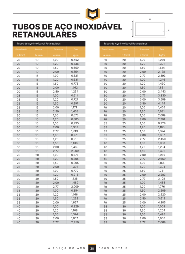 Os tubos retangulares 304 são provenientes de tiras de aço inoxidável 304, submetidas a processo de perfilação e soldagem, sendo fabricados conforme a norma ASTM A554 com acabamento polido.